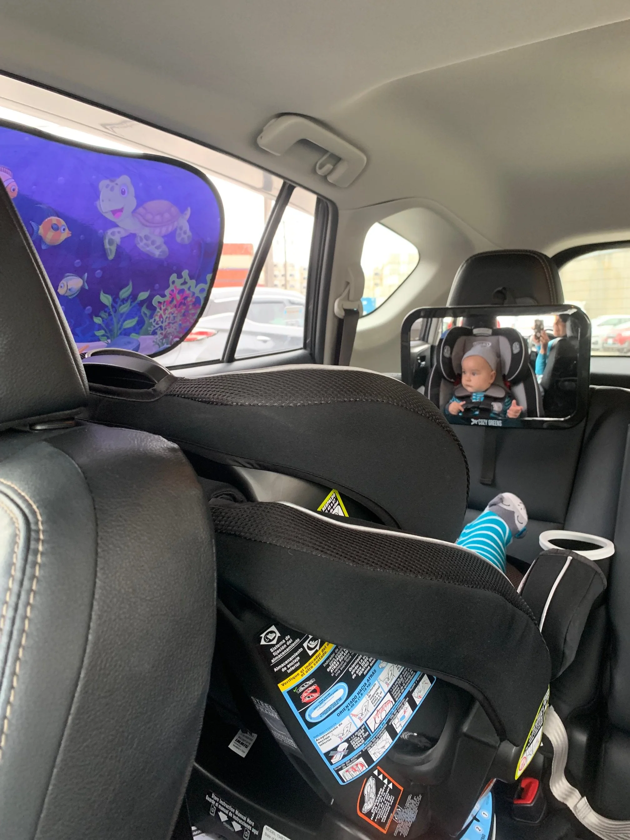 Our carseat mirror that makes me feel much more confident driving with my son. I’d also recommend this sun shade. Hero also enjoys flapping it at his reflection on cloudy Seattle days when entertainment in the carseat is needed.